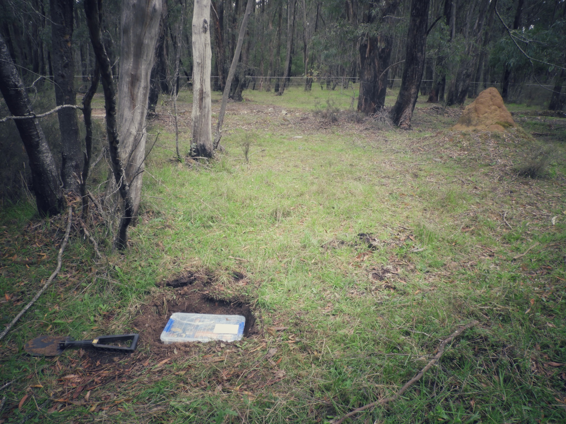 Amint a képek talán mutatják, az idő, amit a szépemlékezetű Néphadseregben töltöttem el, pontonos- és deszant-átkelőként, nem teltek el hiába. Az egyes-harcos, akna telepítési kiképzés során elsajátított módon, ’67 mintájú gyeptéglát készítettem, majd ez alá rejtettem el a vésztartalékaimat. Azért, biztos ami biztos alapon, hagytam a ládán üzenetet a megtalálónak (felkészülve a legszemfülesebbekre), hogy ugyan ne vigyék már el – ha meg is találják – ezt a javadalom vésztartalékot, ti. akkor nagyon éhes leszek az utam második felében. Remélem a kenguruk is tudnak olvasni.