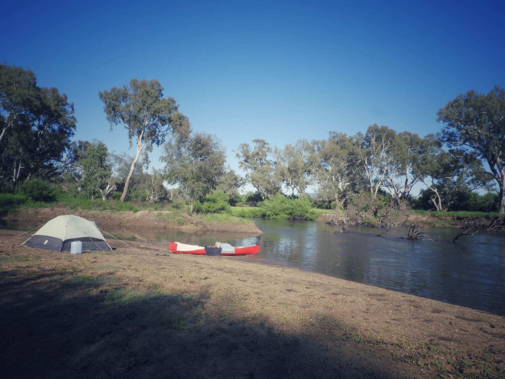 Majd 50 km haladtunk és estére már Walwa mellett a kempingben aludtunk. Amikor megéreztem hogy még elérhetjük a “csatlakozást” a forró zuhanyhoz, kétszeres erővel lapátoltam. Ma is volt egy meleg szituáció, de ma szerencsére sikerült elkerülni a vízbetörést. Csak szegény Charlotte feneke bánta a dolgot. A folyó esése egyelőre nem sokat változott, bár talán mintha egyre gyakrabban lennének nyugodtabb szakaszok, bár az is látszik, hogy szokott itt ennél nagyobb víz is lenni.